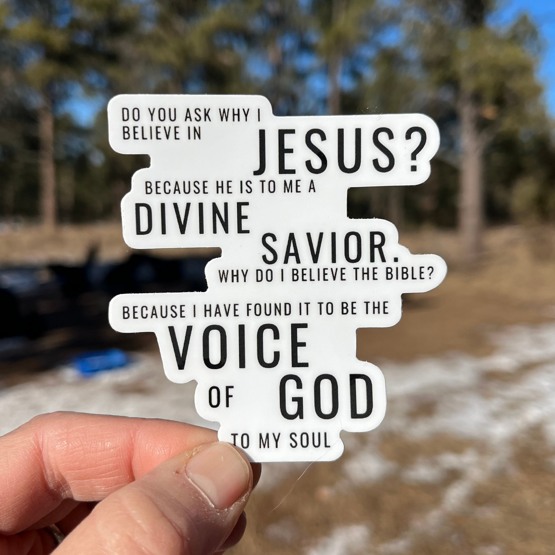This beautifully crafted vinyl sticker features one of my favorite quotes from Ellen G. White, "Do you ask why I believe in Jesus? Because He is to me a divine savior. Why do I believe the Bible? Because I have found it to be the voice of God to my soul." The sticker is perfect for anyone seeking encouragement and a reminder of the blessings in their daily lives.