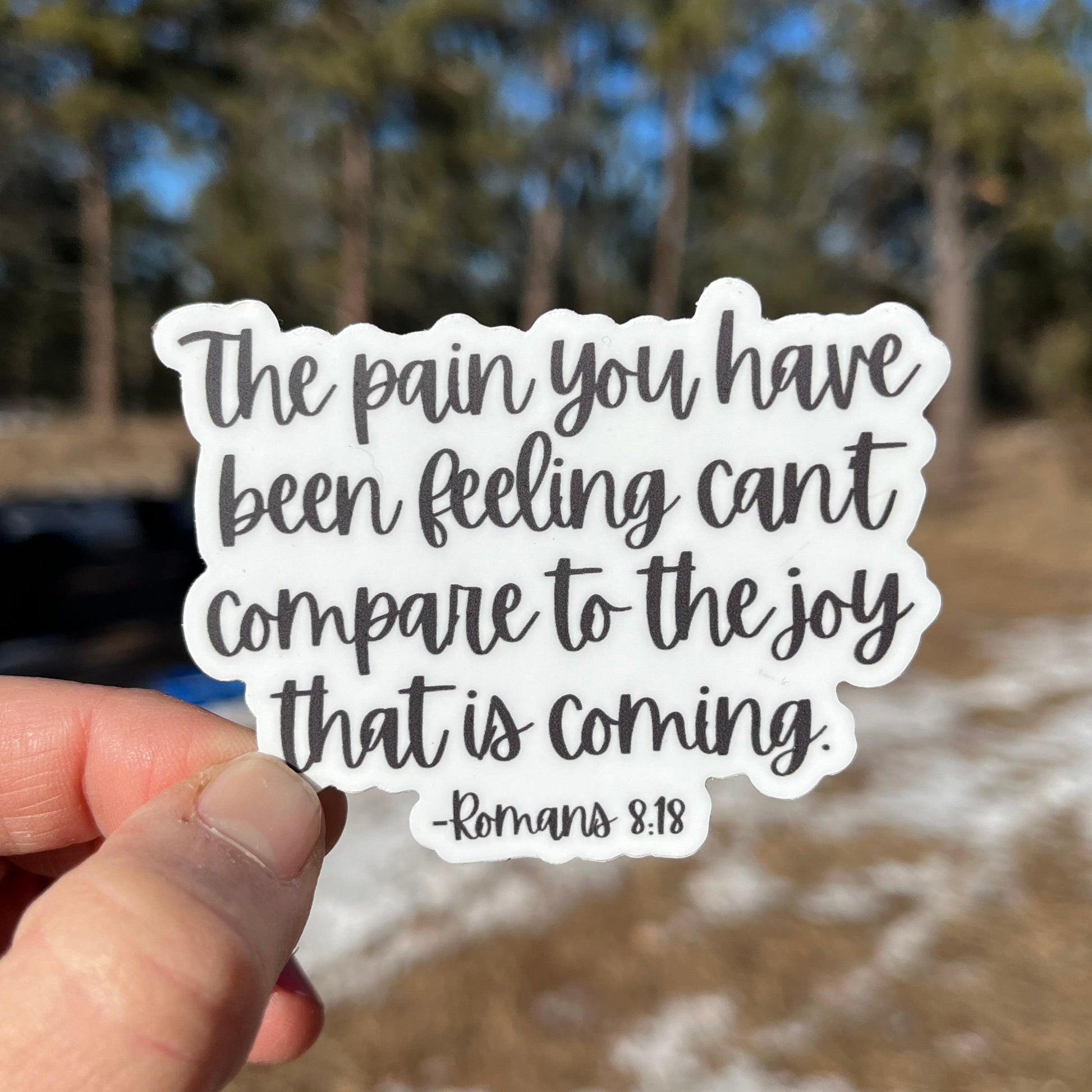 This beautifully crafted vinyl sticker features the Bible verse, "The pain you have been feeling can't compare to the joy that is coming, Romans 8:18" The sticker is perfect for anyone seeking encouragement and a reminder of the blessings in their daily lives.