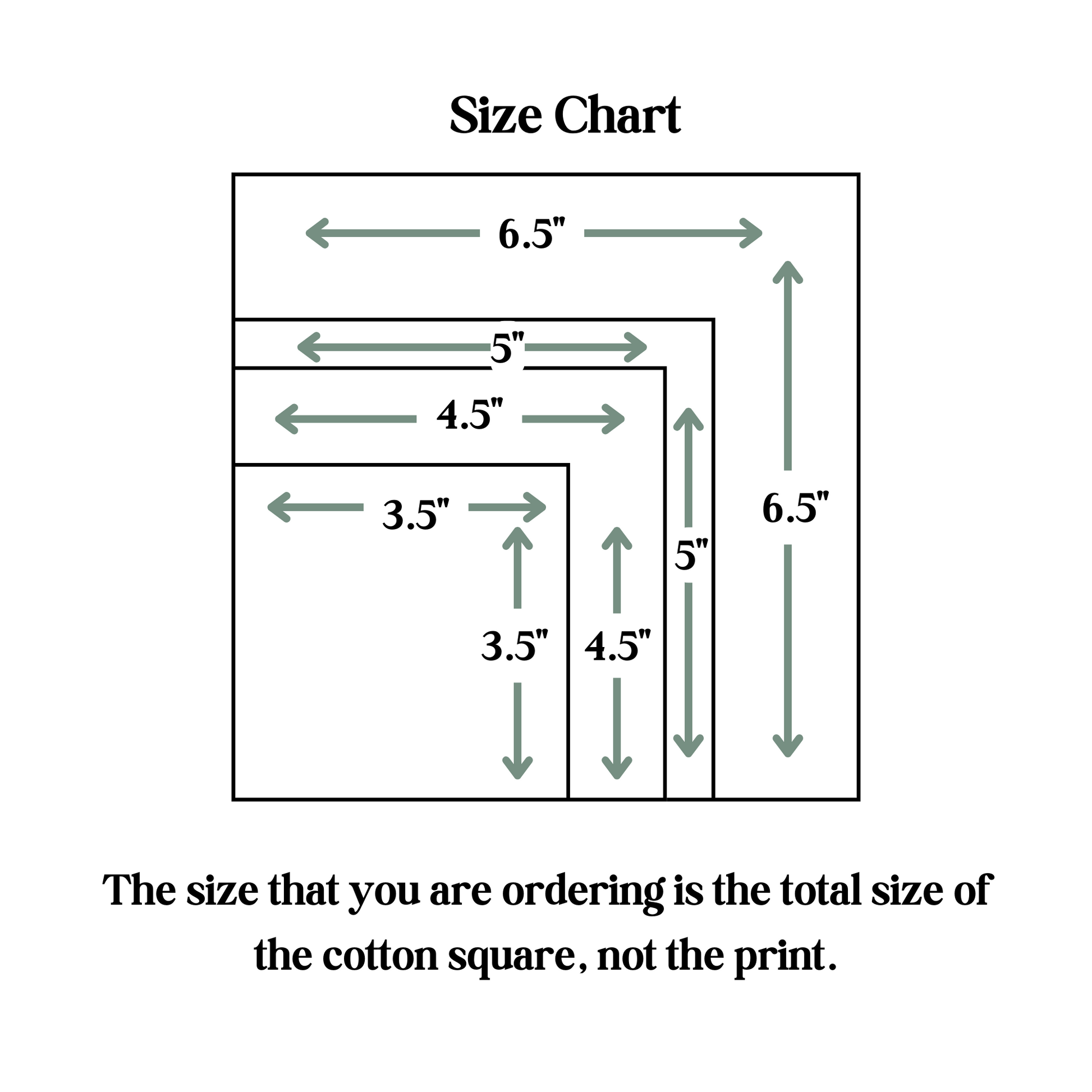 - Size: 3.5", 4.5" or 5" square (total fabric size)